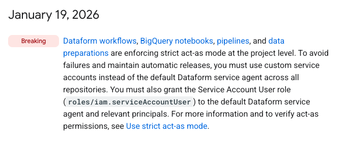 Google verschärft die Sicherheits- und Berechtigungslogik für Dataform-Workflows, BigQuery Notebooks, Pipelines und Data Preparations. Ab sofort wird projektweit ein strikter Act-As-Modus durchgesetzt.
