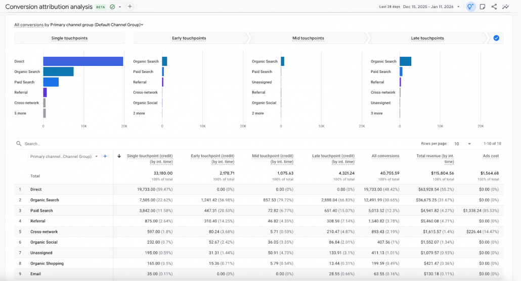 Hier werden Touchpoints in Early, Mid und Late Stage kategorisiert. Zusätzlich trennt der Report Single-Touchpoint-Journeys von Multi-Touchpoint-Journeys. Dadurch wird klarer, welche Kampagnen komplexe Kaufentscheidungen abschließen und welche als alleinige Conversion-Treiber fungieren.
