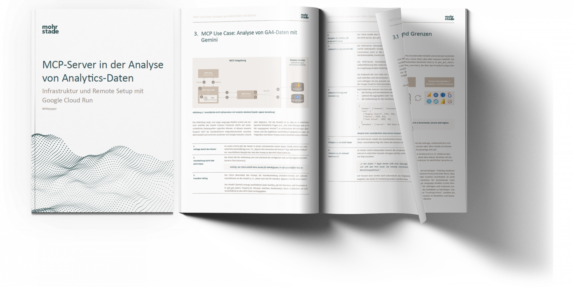 Unser Whitepaper zeigt, wie MCP als standardisierte Schnittstelle zwischen KI-Modellen und Analytics-Systemen dient und es ermöglicht, Analytics-Daten sicher und kontextbasiert per natürlicher Sprache zu analysieren. Anhand eines praxisnahen Setups mit Google Cloud Run wird erläutert, wie Unternehmen Self-Service-Analytics neu denken und nachhaltig in ihre bestehende Dateninfrastruktur integrieren können.